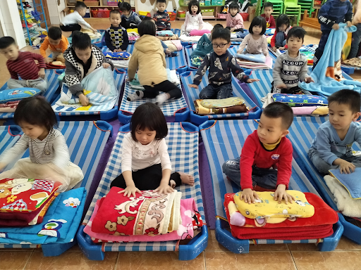 Sau giờ ngủ trưa, bé tập gấp chăn gọn gàng, cất gối đúng chỗ.