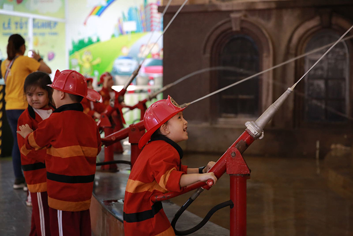 Hoạt động có sự hỗ trợ của các thầy cô và nhân viên nhà trường, tạo ra mô phỏng tình huống giả định cháy. Các bé vừa háo hức, vừa tập trung lắng nghe và thực hành nghiêm túc. Nhờ vậy, bé dần hình thành ý thức phòng tránh rủi ro và tự bảo vệ bản thân.